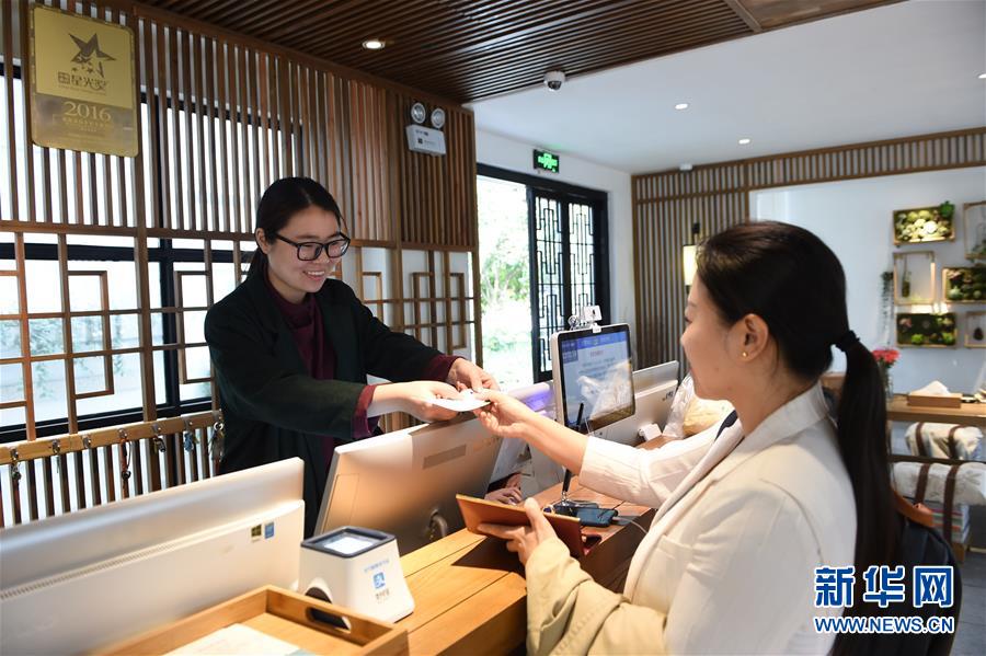 10月31日,在苏州市吴江区同里古镇的一处酒店,工作人员在帮游客办理入住手续。新华社记者李博摄