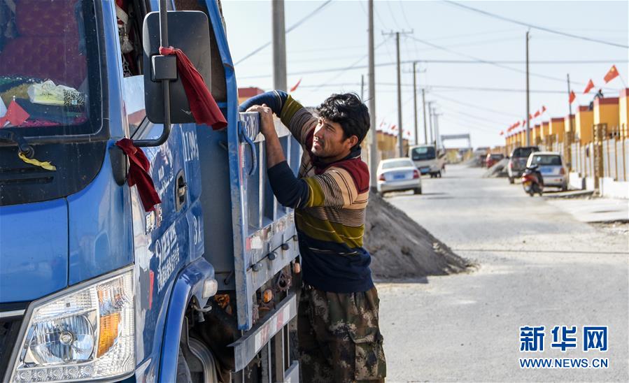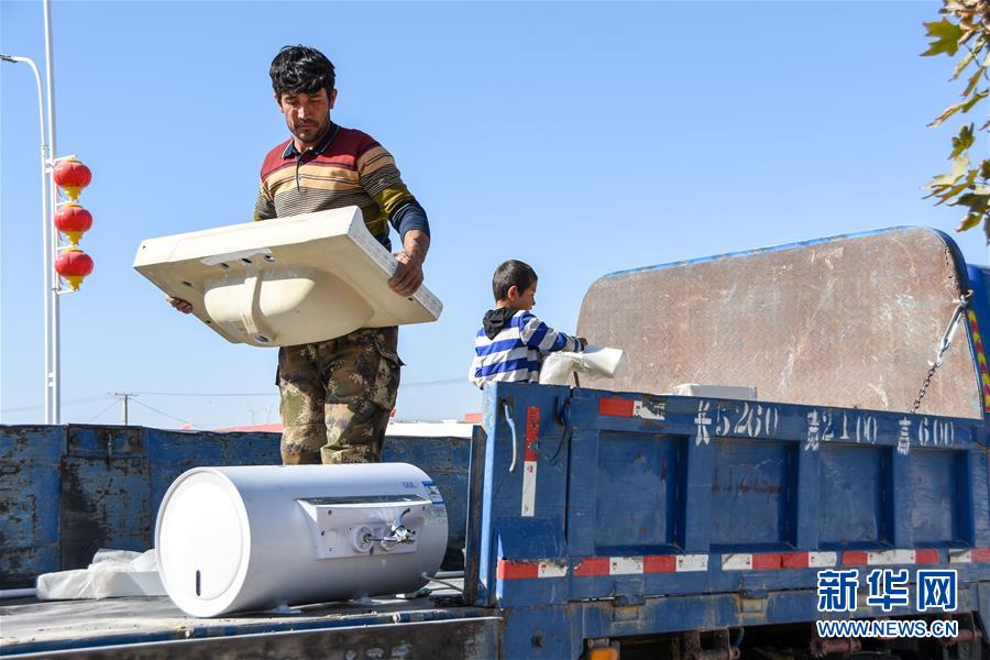 10月28日,买合肉甫·木拉吧在小儿子的帮助下装运货物。 新华社记者 关俏俏 摄