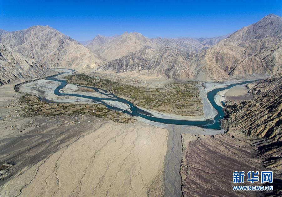 这是位于昆仑山深处的克孜勒苏柯尔克孜自治州阿克陶县库斯拉甫乡,叶尔羌河从村庄流过(10月27日无人机拍摄)。 新华社记者 关俏俏 摄