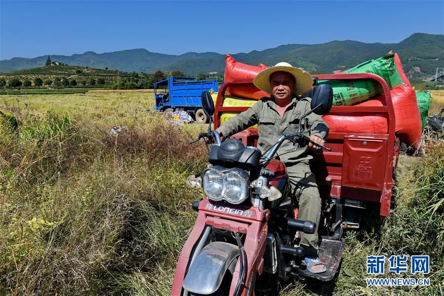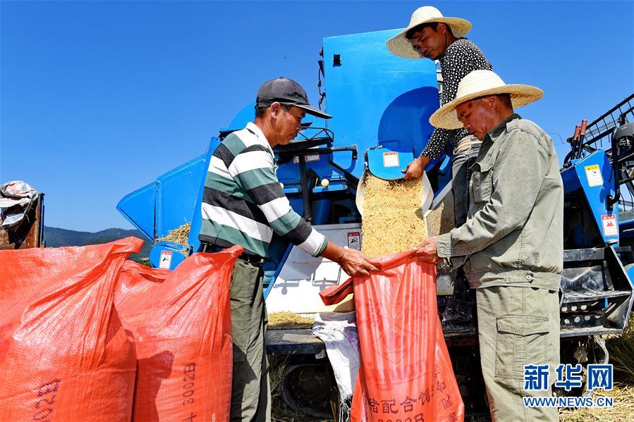 10月31日,武夷山市兴田镇南岸村农民在装运稻谷。 新华社记者 张国俊 摄