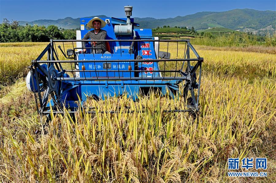 10月31日,武夷山市兴田镇南岸村农民在田间收割稻谷。 新华社记者 张国俊 摄