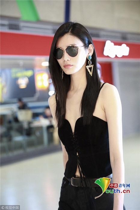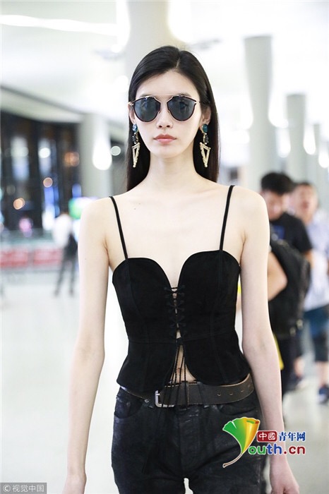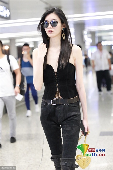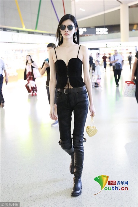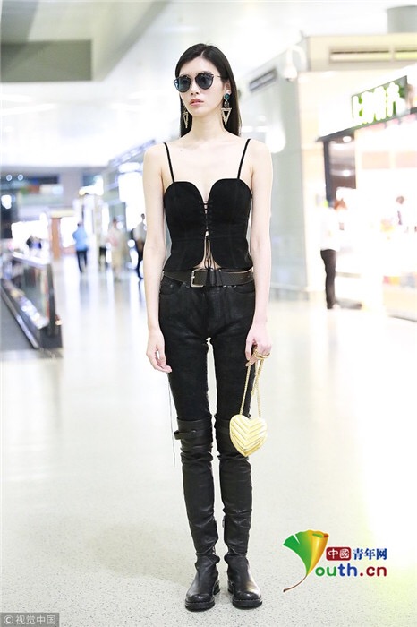 2018年7月25日,上海,奚梦瑶现身机场,她穿吊带马甲配过膝长靴,频撩发似女特工。
