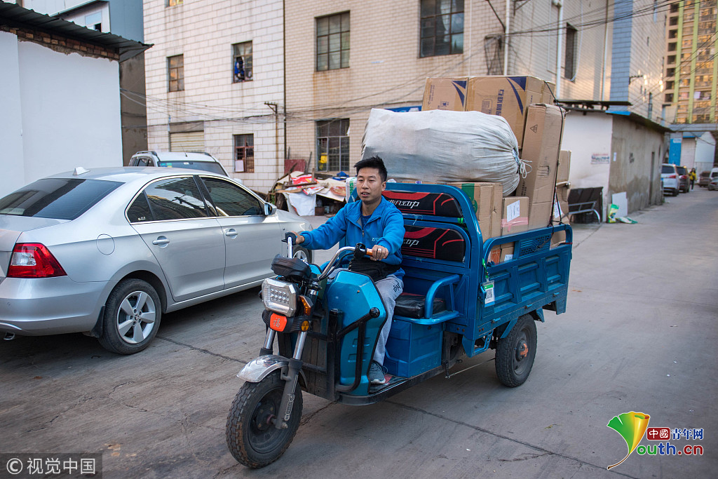 云南省昆明市,摄影师实拍90后快递员熊忠桃的一天工作。作为一名快递员,他25岁就买了房。图片作者:锐图