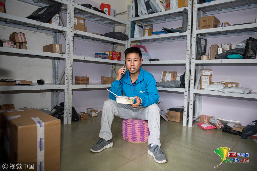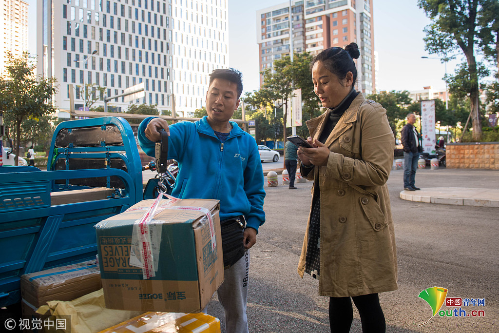 2018年10月16日,云南省昆明市,摄影师实拍90后快递员熊忠桃的一天工作。作为一名快递员,他25岁就买了房,9月份收入3万多。图片作者:锐图