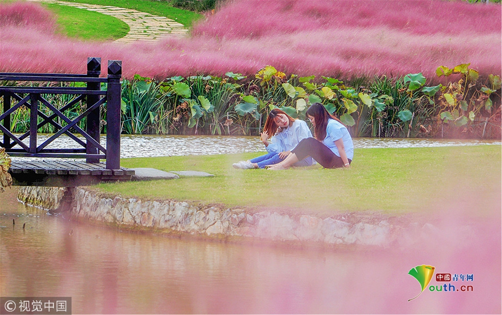 2018年9月26日,江苏镇江。金秋时节,美景醉人。这两天,句容宝华山下大片的粉黛乱子草全部泛红,形成一片梦幻的粉色草海,如云霞似粉雾,美的令人窒息,为这个金秋增添了一道浪漫的气息。
