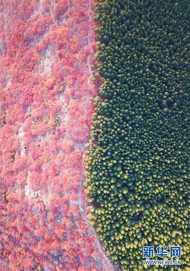 这是山东济南楔子山色彩分明的树林(10月31日无人机拍摄)。  新华社记者朱峥摄