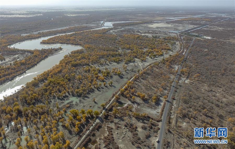 从空中俯瞰新疆尉犁县喀尔曲尕乡,两条道路沿着塔里木河岸边的金色胡杨向前延伸(10月25日无人机拍摄)。 10月中下旬,静静的塔里木河中下游一片金黄。胡杨深处,条条小路蜿蜒绵长通向远方,引人入胜。 塔里木河是中国最长的内陆河,这一区域原始胡杨林分布较为集中。随着塔里木河连续19次向下游生态输水,为胡杨林“解渴”,塔河两岸生态得到明显改善,沙地面积逐年减少。 新华社记者赵戈摄