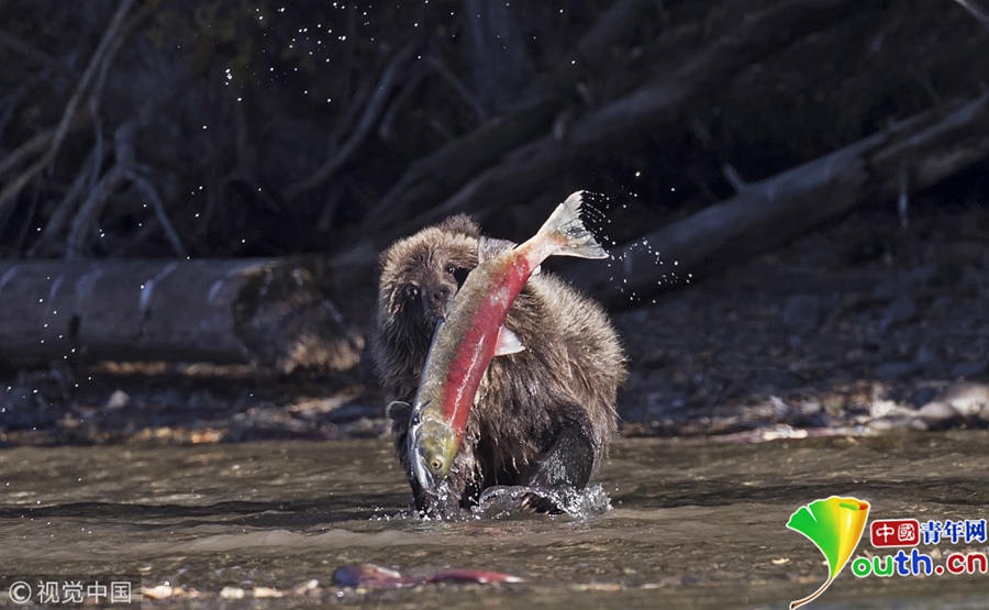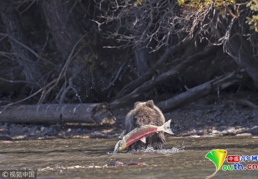 2018年10月29日讯(具体拍摄时间不详),加拿大英属哥伦比亚,一只15个月大的棕熊幼崽在Chilko Lake湖畔成功捉到一只4公斤重的红色鲑鱼。