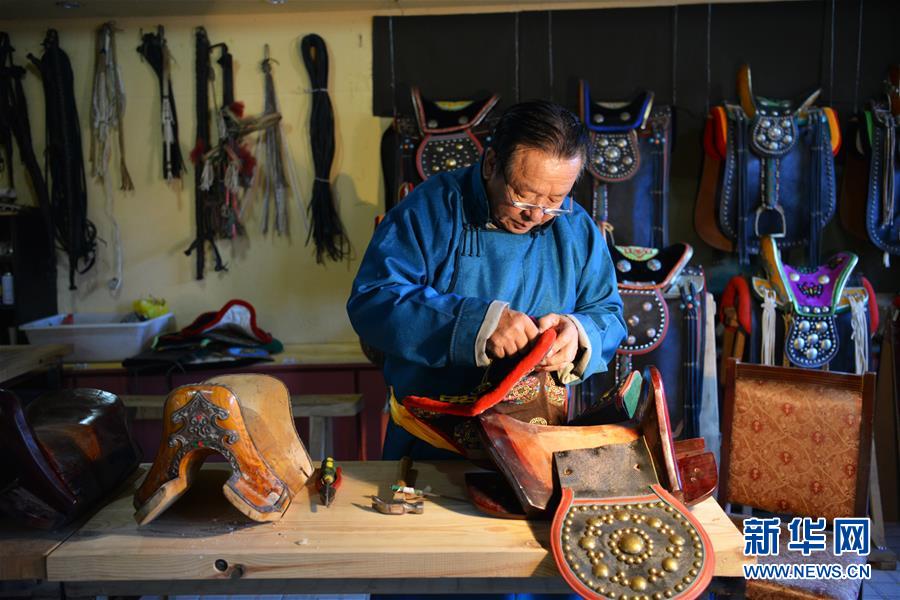 10月31日,在内蒙古自治区通辽市科尔沁左翼后旗,套格敦白乙在工作室制作马鞍。 内蒙古自治区通辽市科尔沁左翼后旗的老匠人套格敦白乙是“蒙古族马具制作技艺”国家级非遗项目的代表性传承人,制作马具长达40余年,他的制作技艺体现了科尔沁马具做工精良、用料考究、使用舒适、装饰华丽的特点。 蒙古族被誉为“马背上的民族”,马具制作历史悠久,在蒙古族传统手工艺中占有重要地位。2008年,蒙古族马具制作技艺被列入国家级非物质文化遗产名录。 新华社记者邹予摄