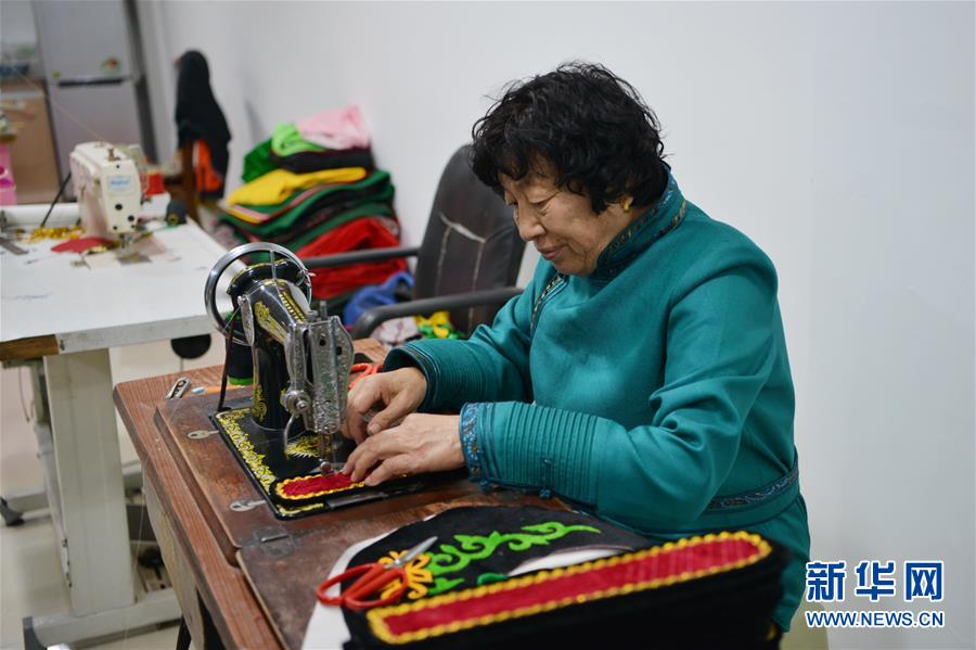10月31日,在内蒙古自治区通辽市市区,套格敦白乙的妻子娜日在缝制马鞍配件。新华社记者邹予摄