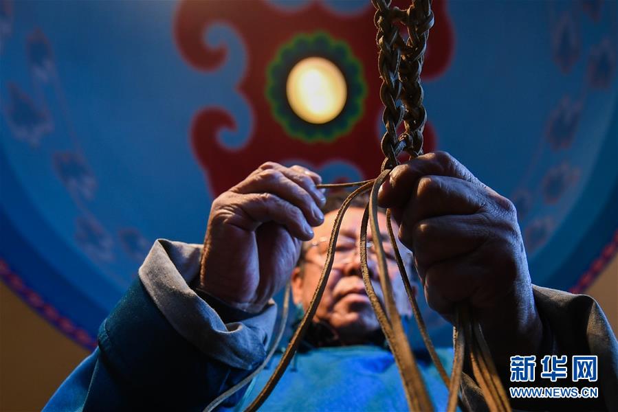 10月31日,在内蒙古自治区通辽市科尔沁左翼后旗,套格敦白乙在工作室里编织马肚带。新华社记者刘磊摄