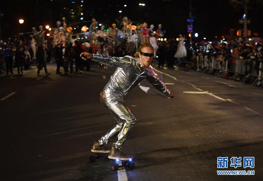 10月31日,在美国纽约曼哈顿,一名男子参加万圣节大游行。
