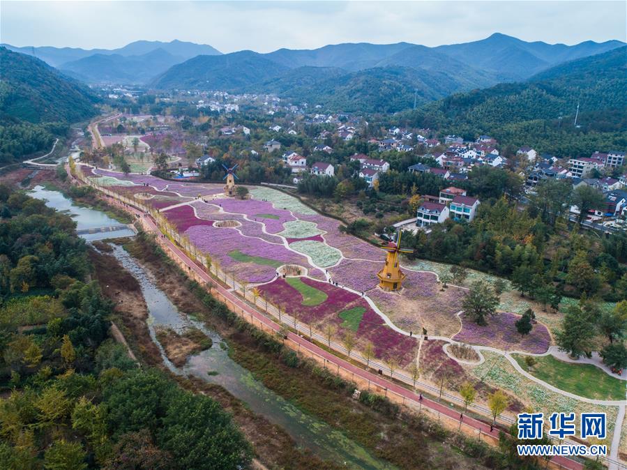 11月2日,空中俯瞰小浦镇的“五彩花海”,多彩的花海与金黄的银杏林构成了一幅美丽的秋季风景(无人机拍摄)。 新华社记者 徐昱 摄