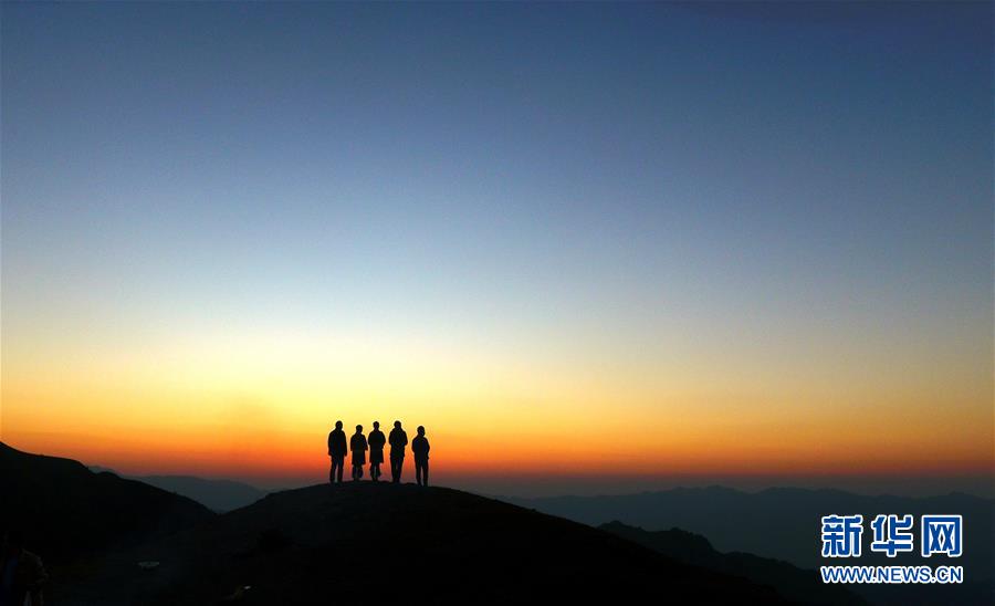11月2日,游客在摩天岭草场欣赏夕阳景色(无人机拍摄)。金秋时节,广西融水苗族自治县杆洞乡尧告村的摩天岭草场天高云淡,景色迷人。新华社记者周华摄