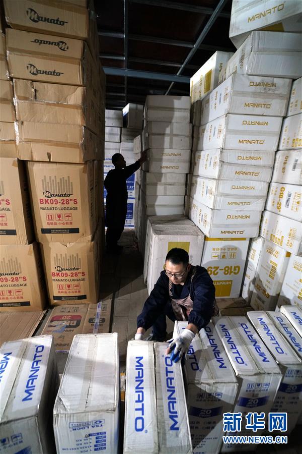 11月3日,贵溪市美纳途箱包公司的工作人员在为“双十一”购物节备货。