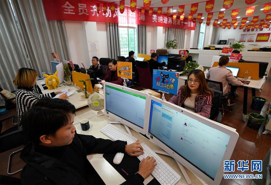 11月3日,贵溪市美纳途箱包公司的客服人员在接受客户咨询。该公司推出的“双十一”购物节预售活动已经开始。新华社记者宋振平摄