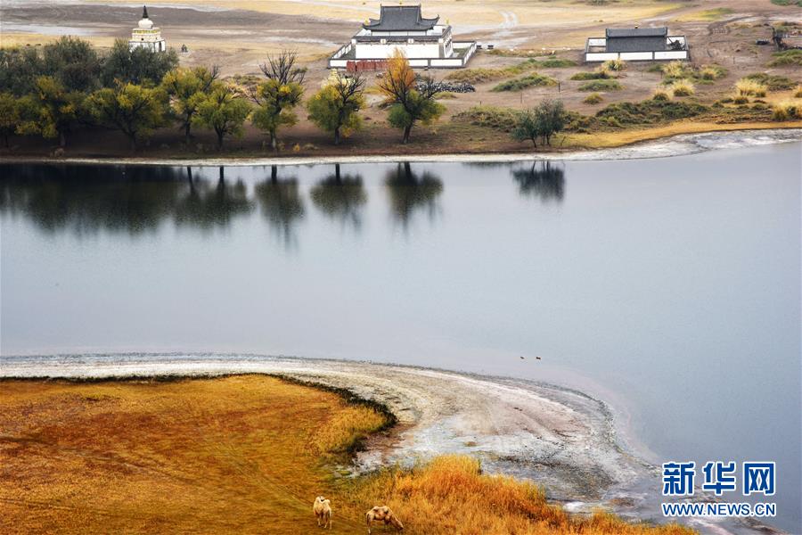 巴丹吉林庙位于名为“庙海子”的湖泊旁(10月19日摄)。巴丹吉林沙漠位于内蒙古西部阿拉善盟,是中国第三大沙漠,沙丘起伏的曲线陡变成高耸的沙山,碧蓝的湖泊散落在沙海间。新华社记者李仁虎摄