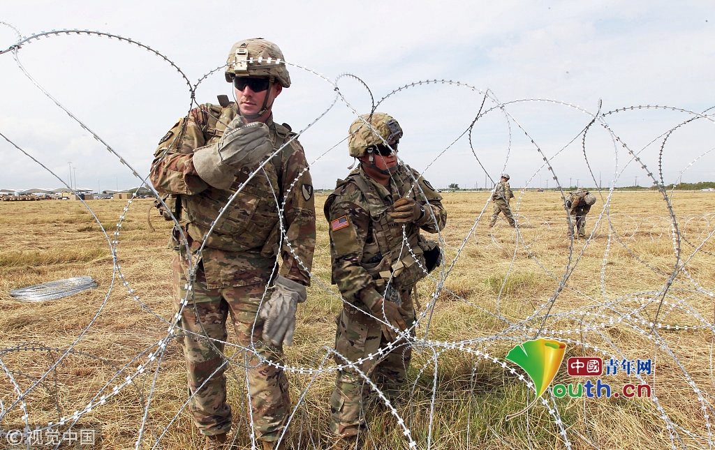 当地时间2018年11月4日,美国得克萨斯州Donna,美国士兵在美国与墨西哥边境的入境口岸附近铺设铁丝网围栏,应对中美洲移民压境。