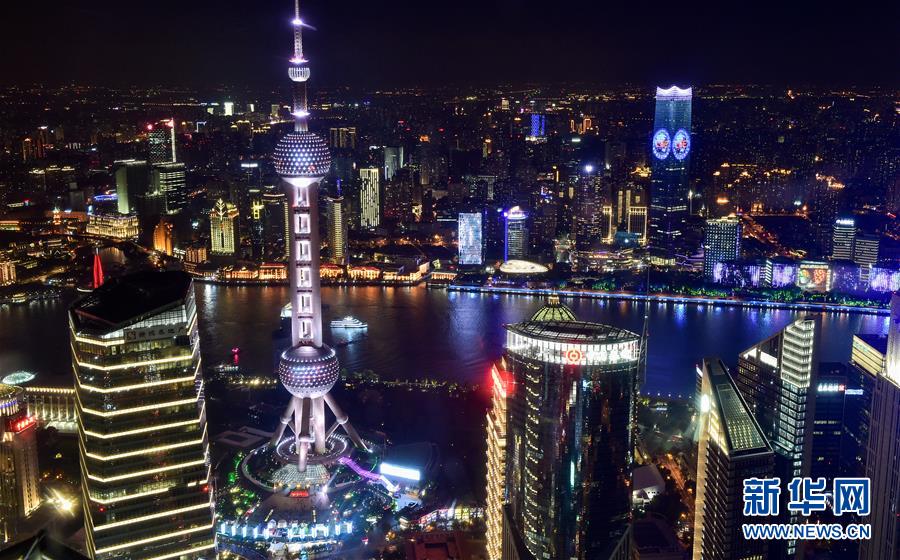 11月3日,夜色中的上海浦江两岸灯光璀璨。 首届中国国际进口博览会即将在上海开幕。美丽的上海张开怀抱,迎接八方来客。 新华社记者 李贺 摄