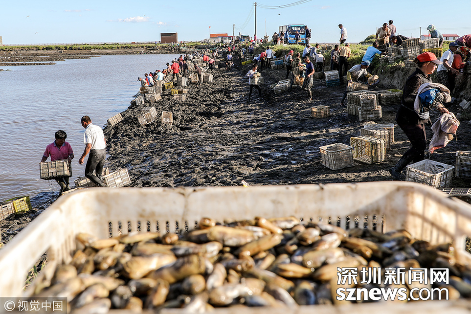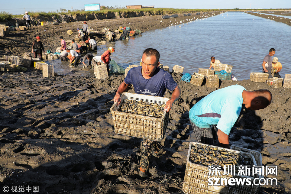 深圳新闻网讯 2018年9月8日,辽宁丹东,早上5点,挖蛏人纷纷下到各个池子,要在海水海泥里艰辛劳作10小时,直至下午3点集体上岸,等待买家的运输车队运走他们的劳动成果。9月初,辽宁沿海养殖区进入养殖海鲜的收获季。在东港,常常出现数百人乃至上千人集结在池子里挖蛏子(这里特指縊蛏,即东港当地人所说的小人仙。下同)的壮观景象。在养殖海鲜的收获季,成群的海鸥趁机“助阵“,人与大自然和谐共处的画面令人叹为观止。