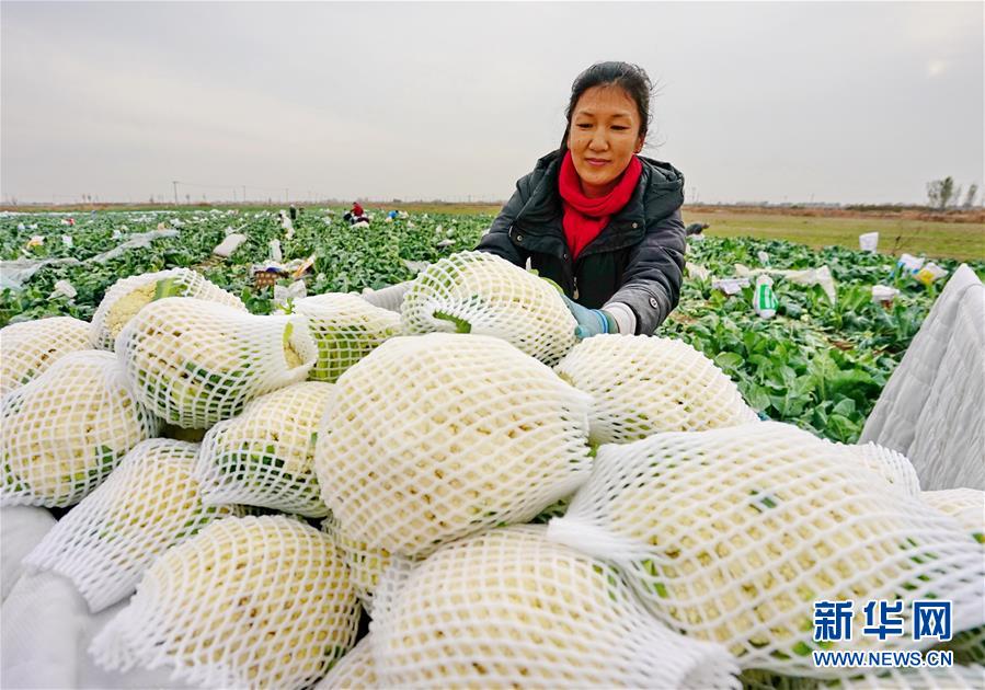 11月5日,唐山海港经济开发区王滩镇东高各庄村的菜农将收获的菜花装车。 新华社记者 杨世尧 摄