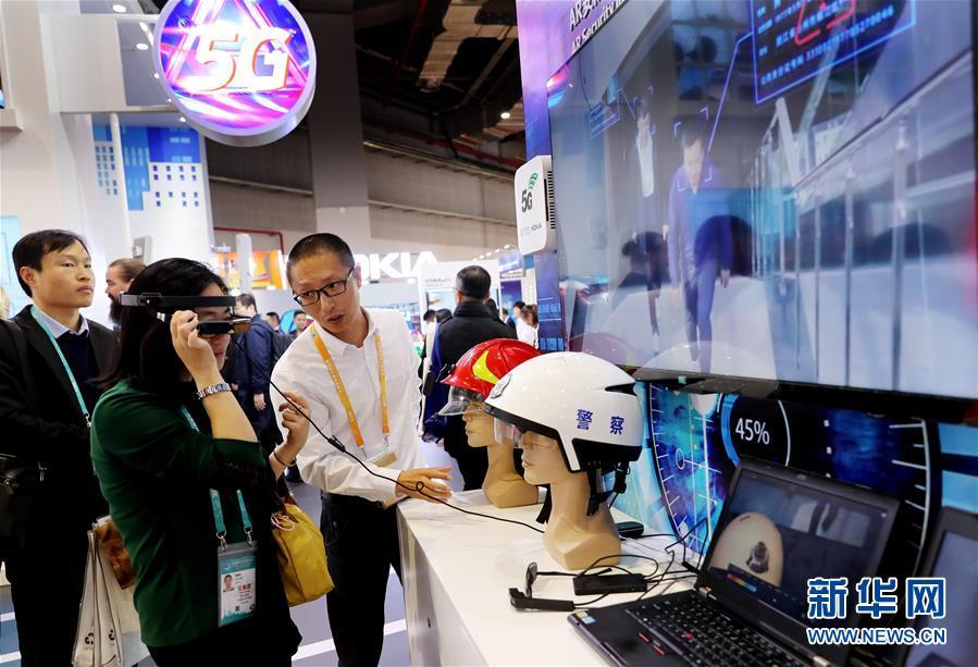 11月5日,一名参观者(左)在诺基亚展台体验一款基于5G通信技术的AR安防系统终端设备。 新华社记者 方喆 摄