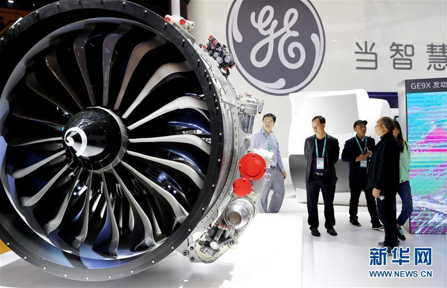 11月5日,参观者在美国通用电气公司生产的飞机发动机模型旁驻足。