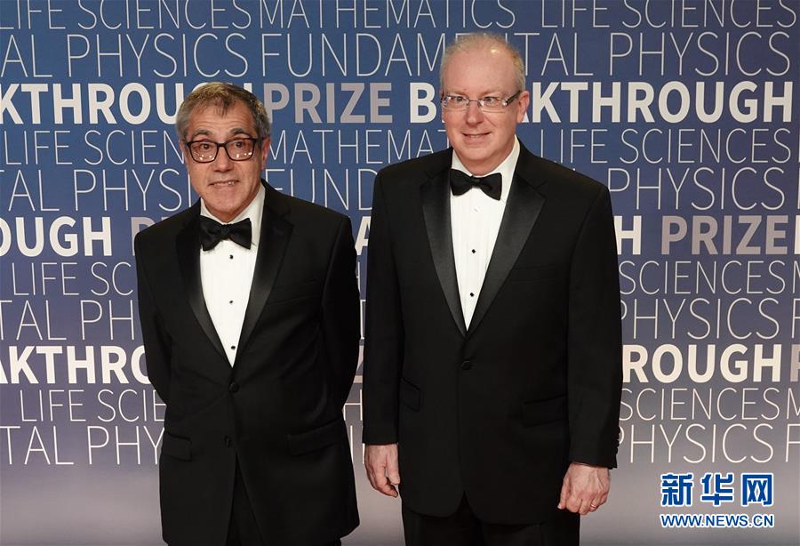 11月4日,在美国旧金山湾区,获得“基础物理学突破奖”的查尔斯·凯恩(右)和尤金·梅林出席红毯仪式。 新华社记者吴晓凌摄