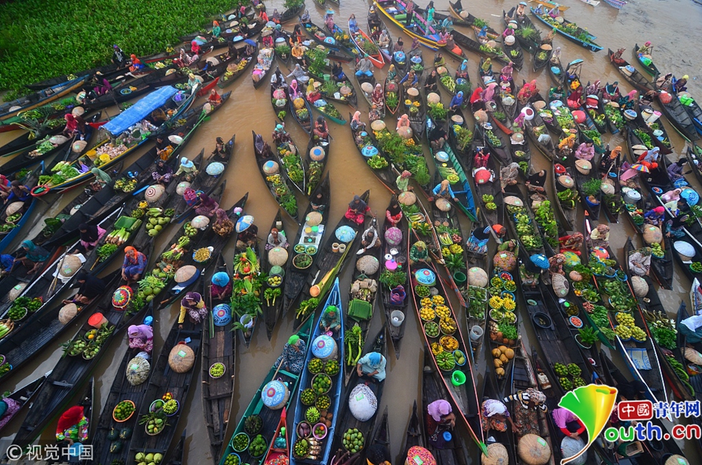富有烟火气息的印尼水上集市 商贩用独木舟载货
