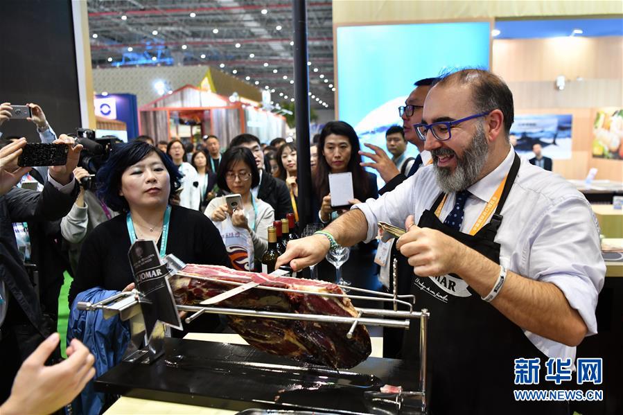 11月6日,西班牙火腿展商何塞(右)向参观者提供伊比利亚黑猪火腿。