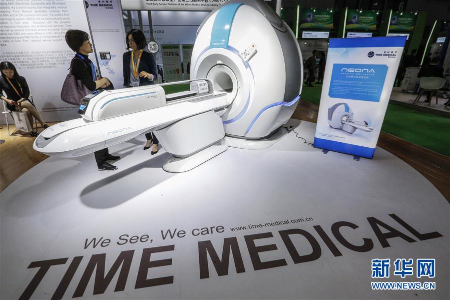 11月6日,美时医疗(美国)有限公司工作人员为参观者介绍世界首台婴幼儿专用核磁共振仪。该设备填补了这个领域的市场空白,体型轻巧,成像分辨率高,更方便在新生儿重症监护室里使用。