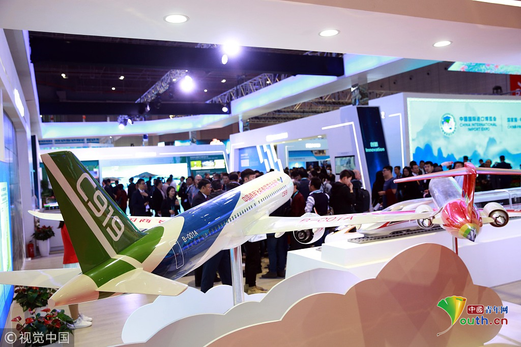 2018年11月6日,上海,首届中国国际进口博览会国家展上,共有82个国家、3个国际组织设立了71个展台。中国馆展示的C919飞机。视觉中国