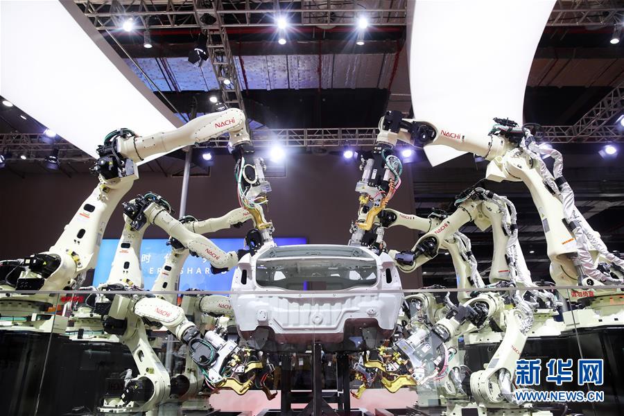 11月6日,日本那智不二越公司展出的点焊密集协作机器人在进行作业演示。