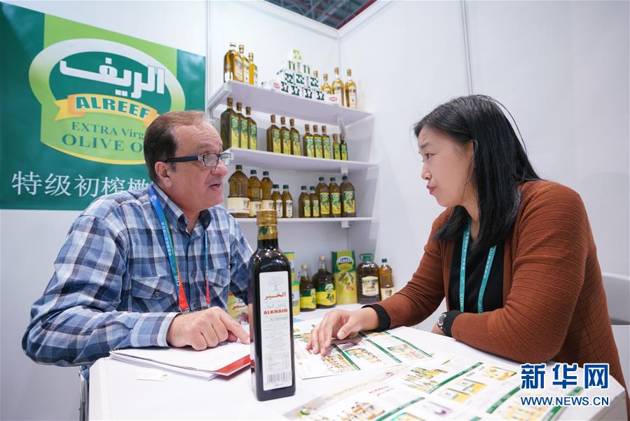 11月6日,叙利亚橄榄油经销商胡萨姆(左)介绍橄榄油产品。 新华社记者 孟鼎博 摄