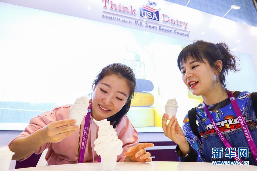 11月7日,两位参观者在进博会食品及农产品展区美国乳品出口协会展台品尝冰激凌。 新华社记者 刘大伟 摄
