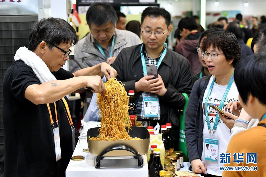 11月7日,来自新加坡广祥泰私人有限公司的工作人员用公司生产的调料为观众现场烹制炒面。 新华社记者 李鑫 摄