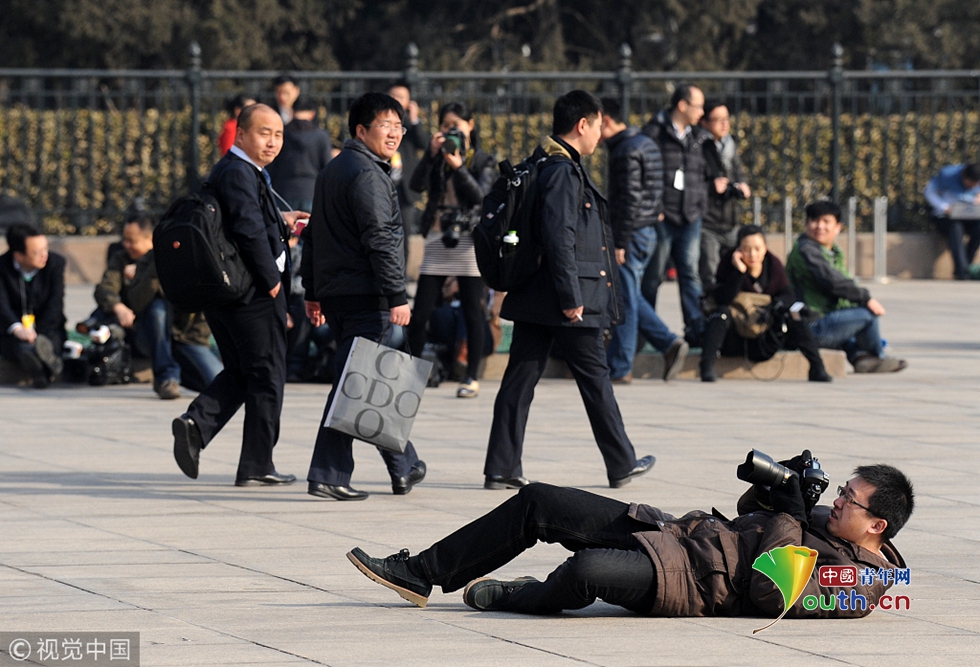 2013年3月5日,北京,一名摄影记者躺在地上仰拍人民大会堂外景。 图片作者:有待/视觉中国
