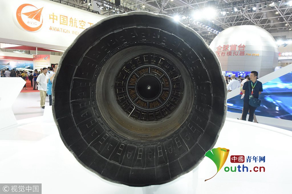 2018年11月7日,珠海航展上,观众在观看国产新型涡扇发动机“太行发动机”。之前的航展上歼10B依托国产发动机一鸣惊人,获得满场喝彩。