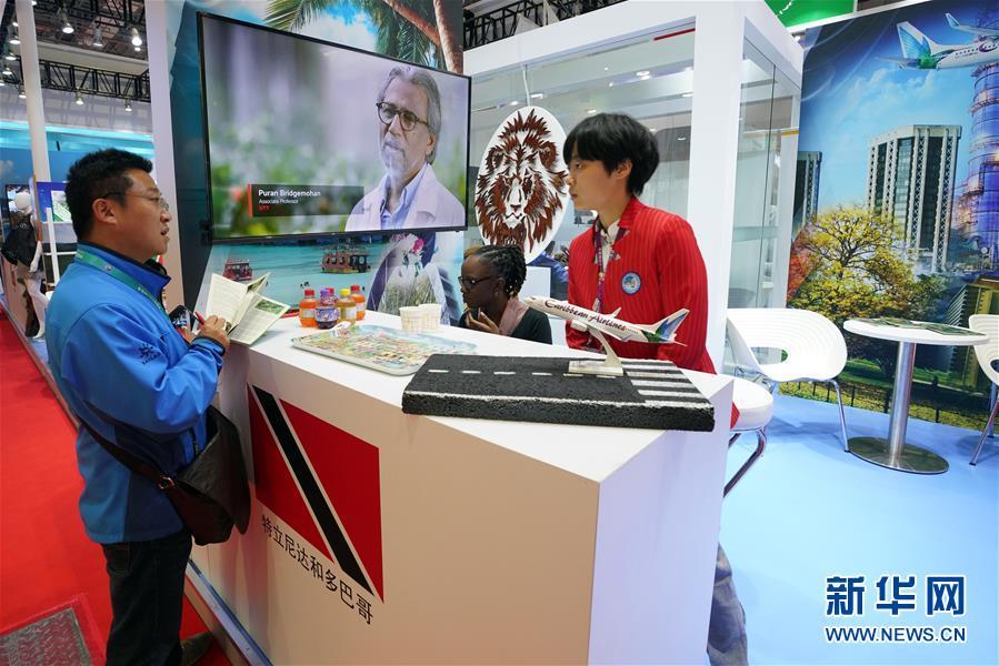11月8日,在加勒比地区国家展区特立尼达和多巴哥展台,一名参观者(左)与工作人员交谈。 中国国际进口博览会11月5日在上海开幕。国家贸易投资综合展(国家展)是中国国际进口博览会的重要内容,共有82个国家、3个国际组织设立71个展台。 新华社记者 程丽 摄
