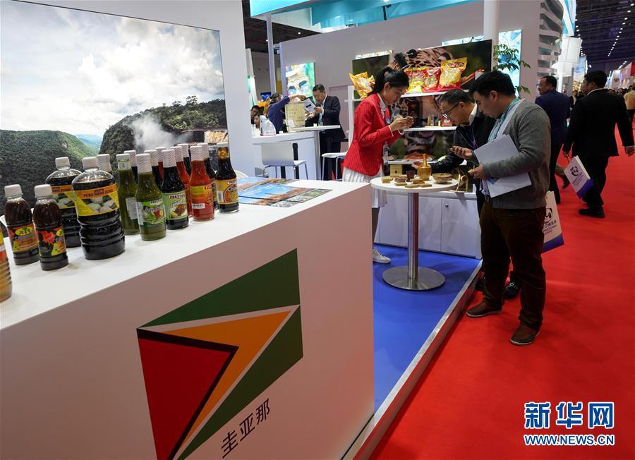 11月8日,在加勒比地区国家展区圭亚那展台,参观者与工作人员交谈。 中国国际进口博览会11月5日在上海开幕。国家贸易投资综合展(国家展)是中国国际进口博览会的重要内容,共有82个国家、3个国际组织设立71个展台。 新华社记者 程丽 摄