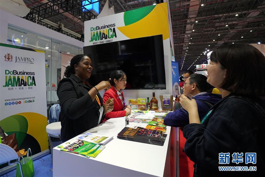 11月8日,在加勒比地区国家展区牙买加展台,工作人员请参观者品尝本国特色食品。 中国国际进口博览会11月5日在上海开幕。国家贸易投资综合展(国家展)是中国国际进口博览会的重要内容,共有82个国家、3个国际组织设立71个展台。 新华社记者 程丽 摄