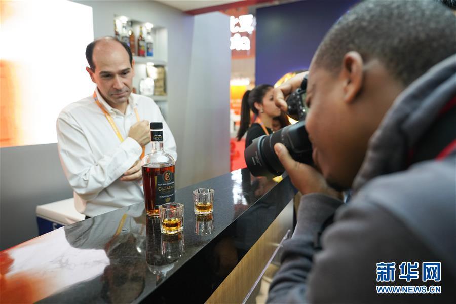 11月7日,在委内瑞拉展区,一名参观者拍摄当地生产的朗姆酒。 中国国际进口博览会11月5日在上海开幕。国家贸易投资综合展(国家展)是中国国际进口博览会的重要内容,共有82个国家、3个国际组织设立71个展台。 新华社记者 王天聪 摄