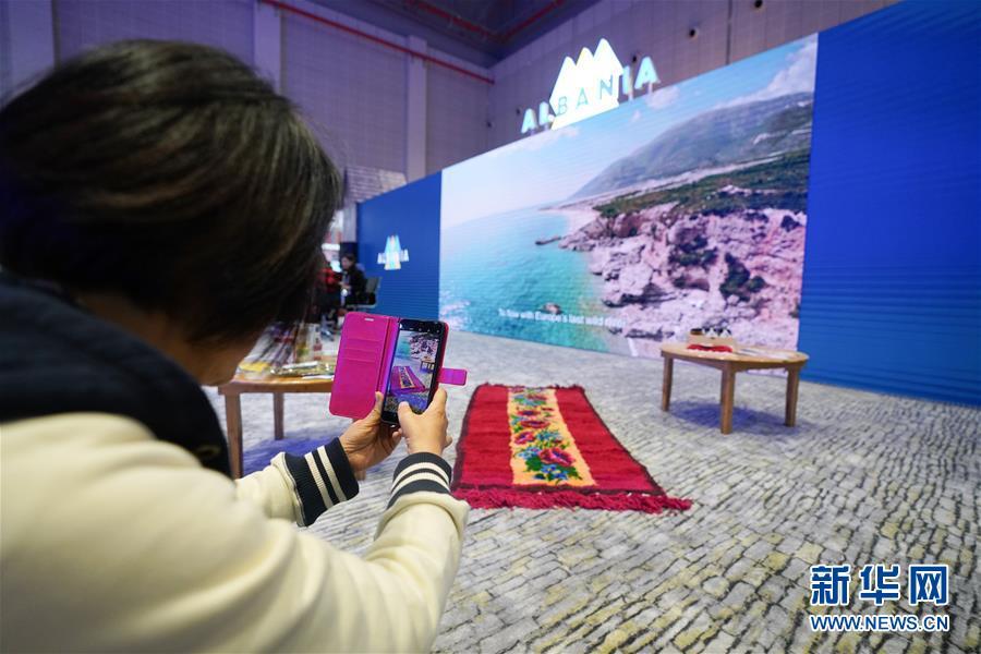 11月7日,在阿尔巴尼亚展区,一名参观者拍摄当地生产的地毯。 中国国际进口博览会11月5日在上海开幕。国家贸易投资综合展(国家展)是中国国际进口博览会的重要内容,共有82个国家、3个国际组织设立71个展台。 新华社记者 王天聪 摄