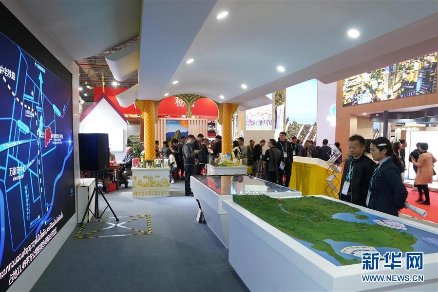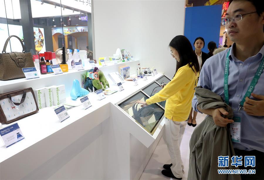 11月8日,人们在老挝展区参观。 中国国际进口博览会11月5日在上海开幕。国家贸易投资综合展(国家展)是中国国际进口博览会的重要内容,共有82个国家、3个国际组织设立71个展台。 新华社记者 程丽 摄