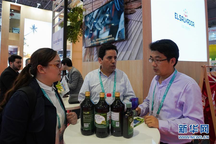 11月7日,在萨尔瓦多展区,一名参观者(左)听取工作人员推介当地生产的诺丽果汁。 中国国际进口博览会11月5日在上海开幕。国家贸易投资综合展(国家展)是中国国际进口博览会的重要内容,共有82个国家、3个国际组织设立71个展台。 新华社记者 王天聪 摄