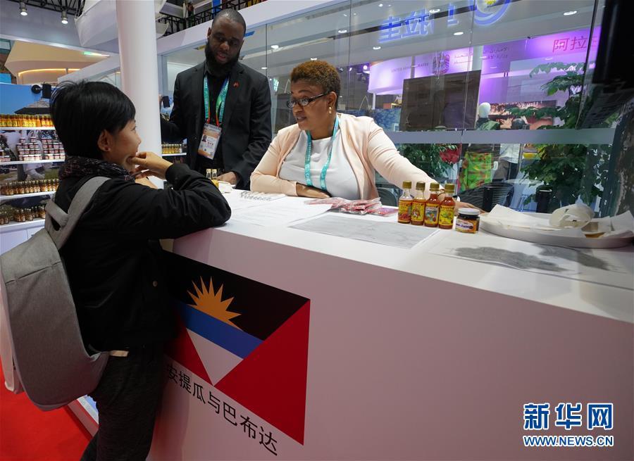 11月8日,在加勒比地区国家展区安提瓜和巴布达展台,一名参观者(左)与工作人员交谈。 中国国际进口博览会11月5日在上海开幕。国家贸易投资综合展(国家展)是中国国际进口博览会的重要内容,共有82个国家、3个国际组织设立71个展台。 新华社记者 程丽 摄