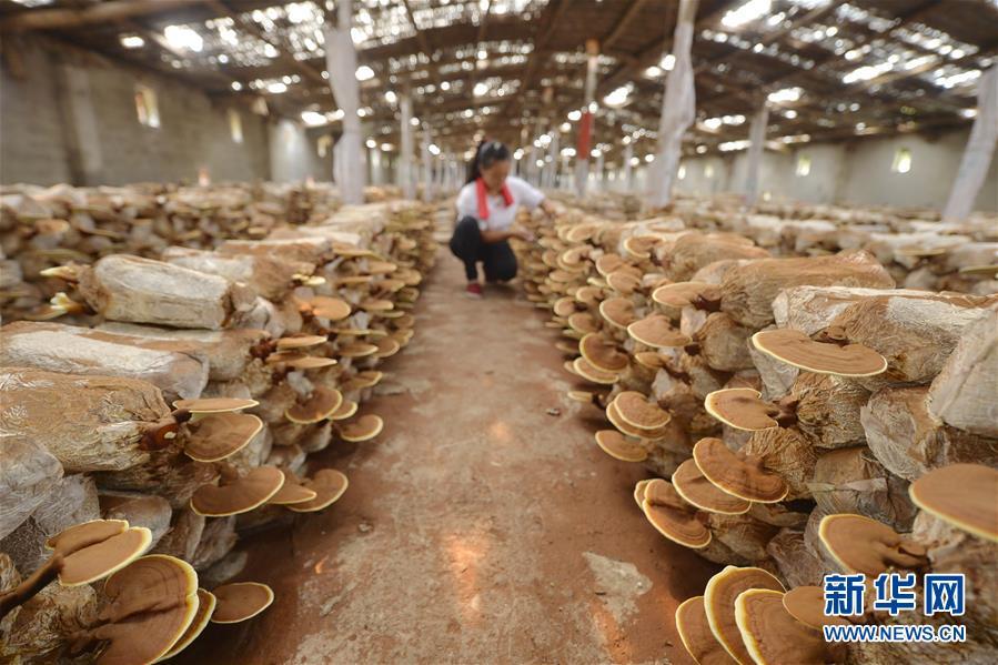 8月22日,河北省沙河市蝉房乡水磨头村农民在大棚内管理种植的灵芝。 新华社记者 牟宇 摄
