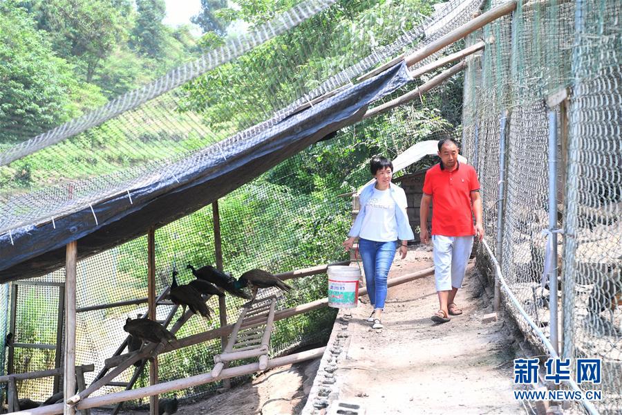 5月16日,在重庆市铜梁区永嘉镇高龙村,阎仁兵(右)和妻子张荣苹在养殖场内巡视蓝孔雀生长情况。