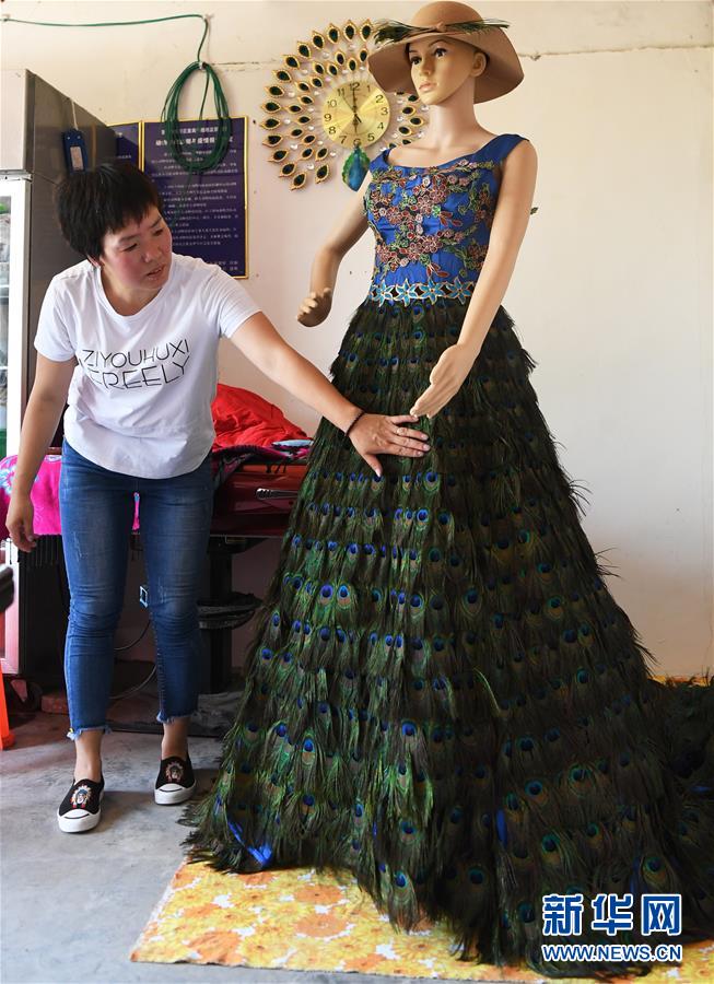 5月16日,在重庆市铜梁区永嘉镇高龙村,张荣苹在整理一件孔雀羽毛服装。 新华社记者 王全超 摄