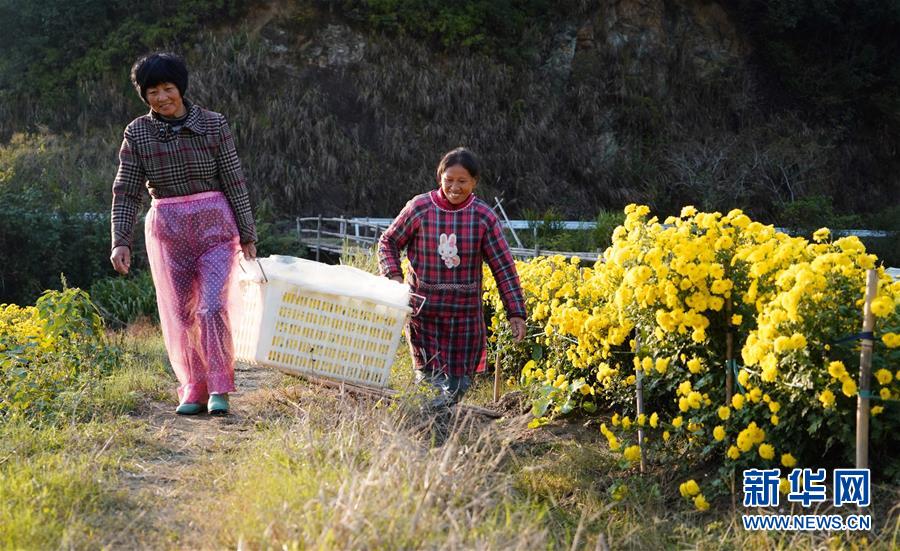 11月8日,婺源县思口镇农户在运送采摘的皇菊。新华社记者 胡晨欢 摄